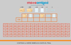 – Con las series simbólicas básicamente queremos trabajar de forma específica las fronteras de los números, es decir, el cambio de centena al sumar o restar una decena. Si estamos en el 496 y queremos sumar una decena estamos pasando del 400 al 500 al igual que si al 305 le quitamos una decena estamos pasando de 300 al 200.