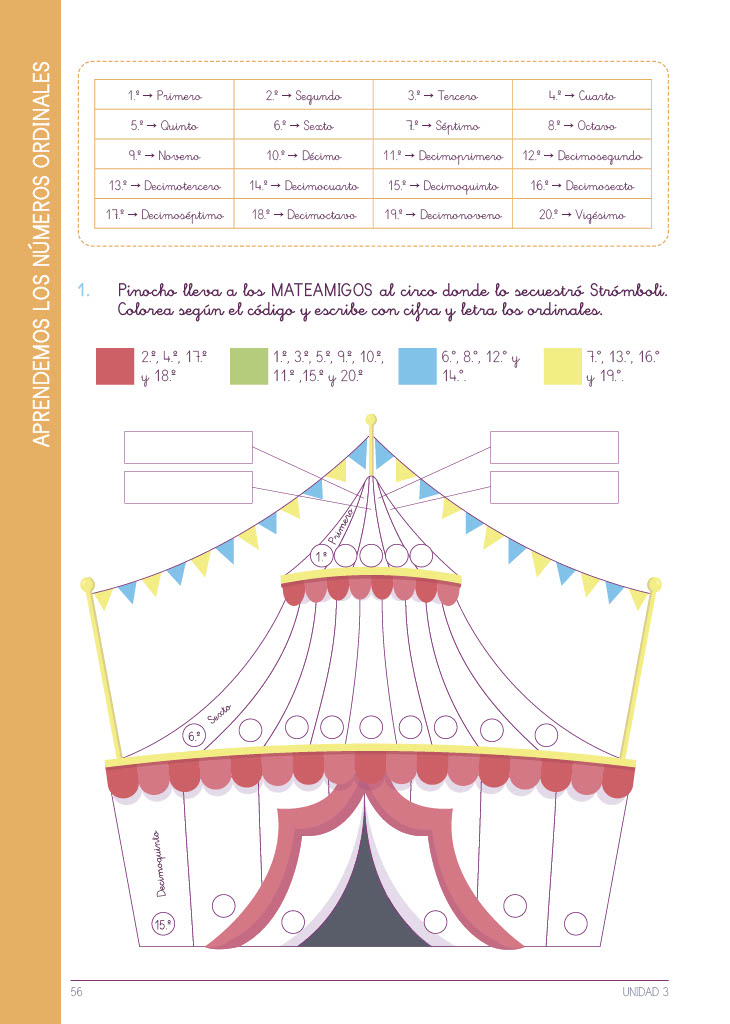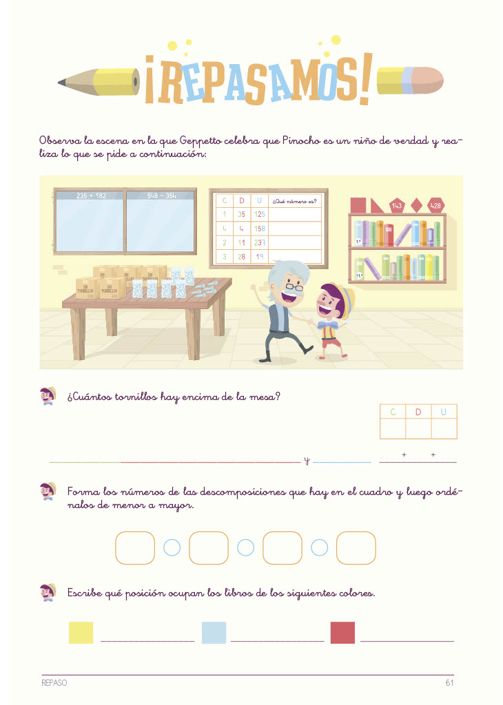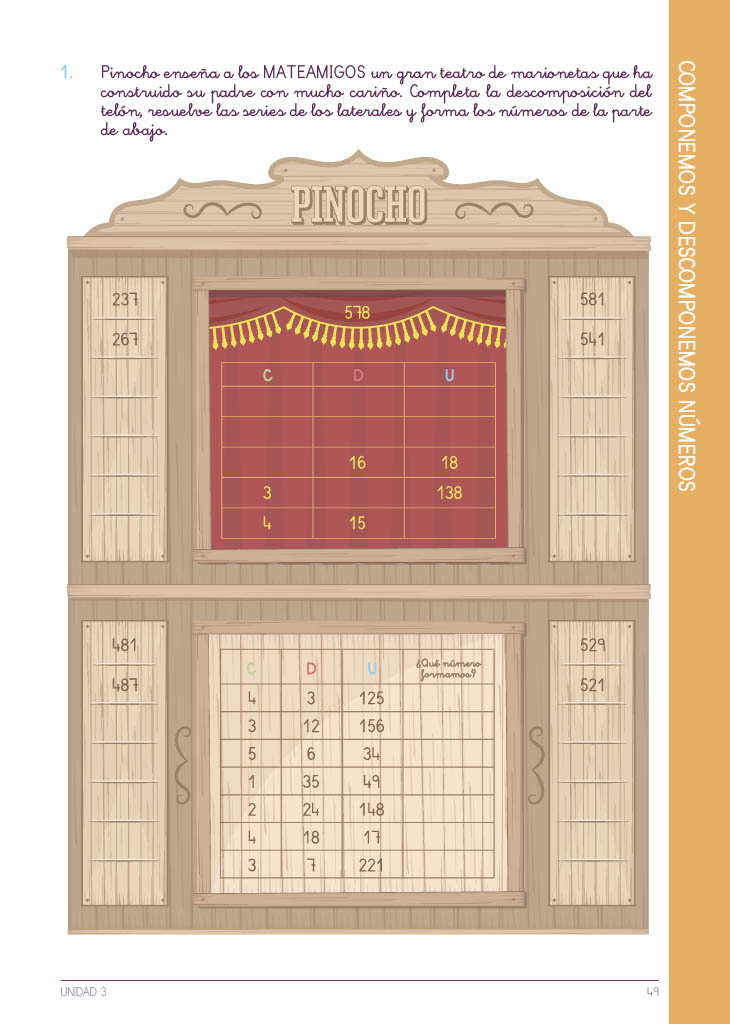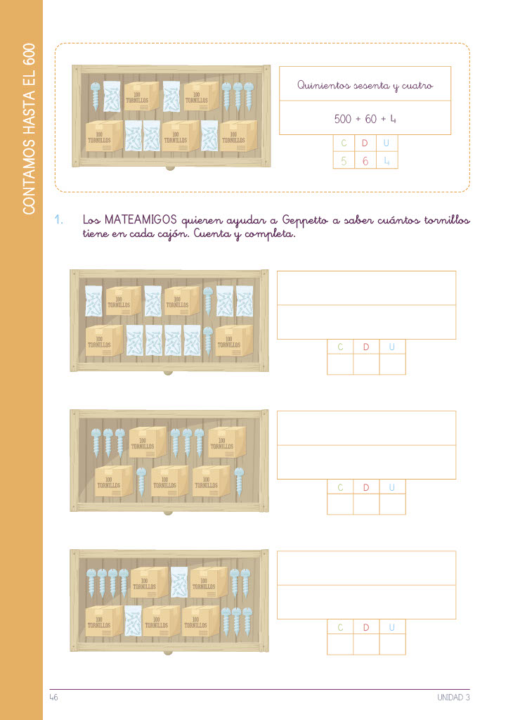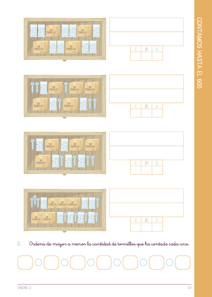 Seguimos trabajando numeración, en este caso hasta el 600. Para ello hacemos ejercicios como los anteriores ya que conocen la dinámica y les resultará más fácil.