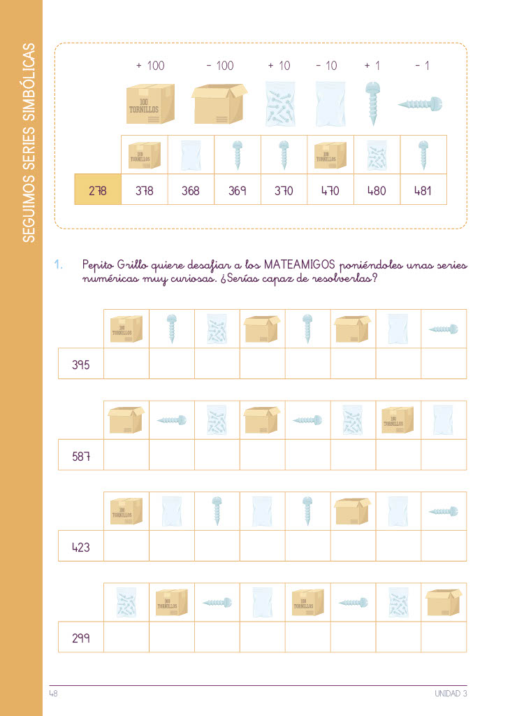 – Con las series simbólicas básicamente queremos trabajar de forma específica las fronteras de los números, es decir, el cambio de centena al sumar o restar una decena. Si estamos en el 496 y queremos sumar una decena estamos pasando del 400 al 500 al igual que si al 305 le quitamos una decena estamos pasando de 300 al 200.