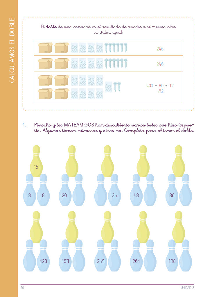 – Cuando se practique con niños que ya empezaron a multiplicar, puede escribirse también: El doble de 5 es 10 porque 5 x 2 = 10
