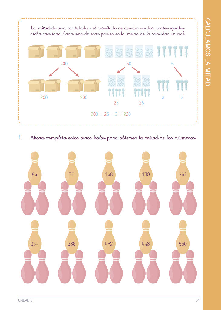 – De esta manera se quiere conseguir que cuando quiera calcular la mitad de un número de 3 cifras como pueda ser el 472, lo haga primero calculando el mitad de cada una de las unidades. De esta manera calculará el mitad de 400, el de 70 y el de 2 por separado para luego juntar todas las cantidades: 200 + 35 + 1 = 236
