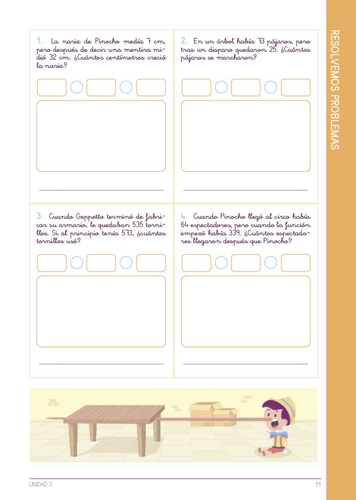 Justificación: La cantidad inicial (longitud de la nariz de Pinocho al principio) se transforma en una cantidad final (longitud de la nariz de Pinocho tras mentir) a través de un aumento (longitud que creció la nariz). Se pregunta por dicho aumento. Operación: 32 – 7 = 25.