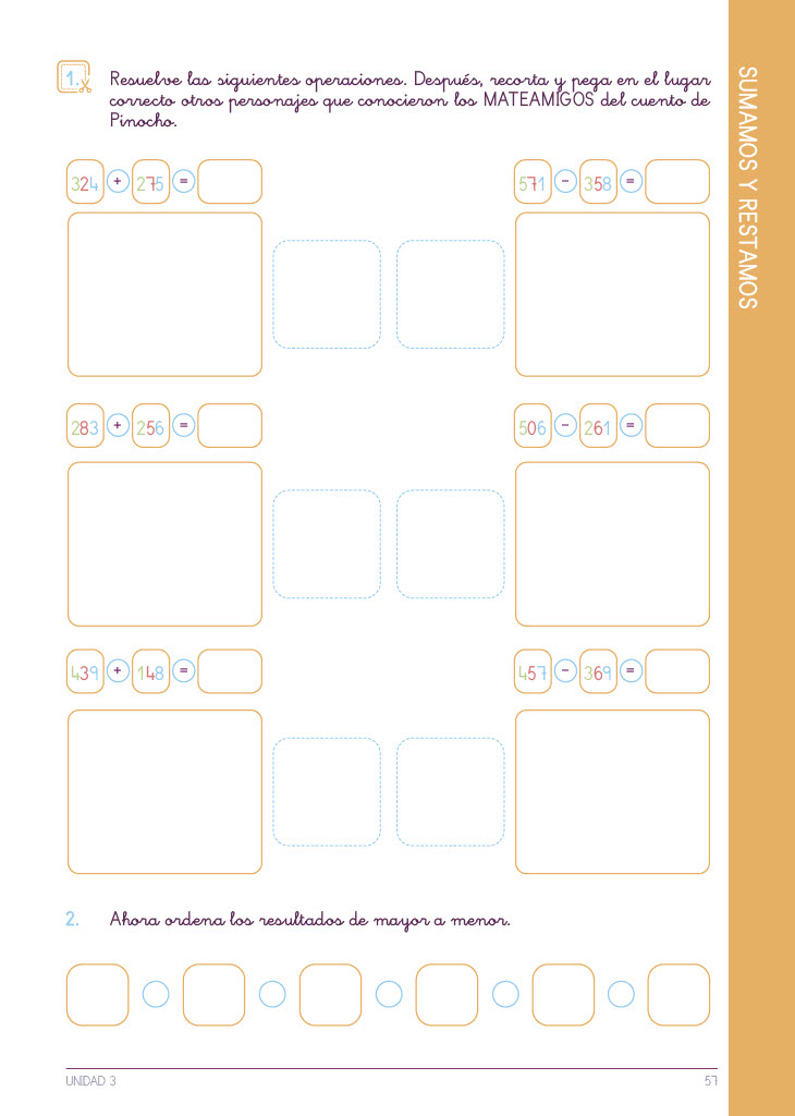 – En esta página resolvemos sumas y restas con números de 3 cifras. En el apartado de materiales de la intranet podréis encontrar 3 de las muchas formas en la que se pueden resolver estos algoritmos.