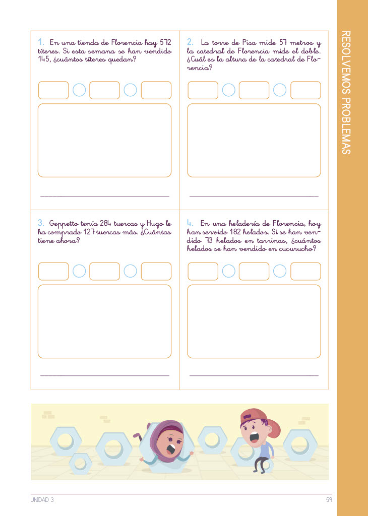Justificación: La cantidad inicial (tuercas que tenía Geppetto) se transforma a través de un aumento (tuercas que le da Hugo) y se convierte en la cantidad final (desconocida). Operación: 284 + 127 = 411.