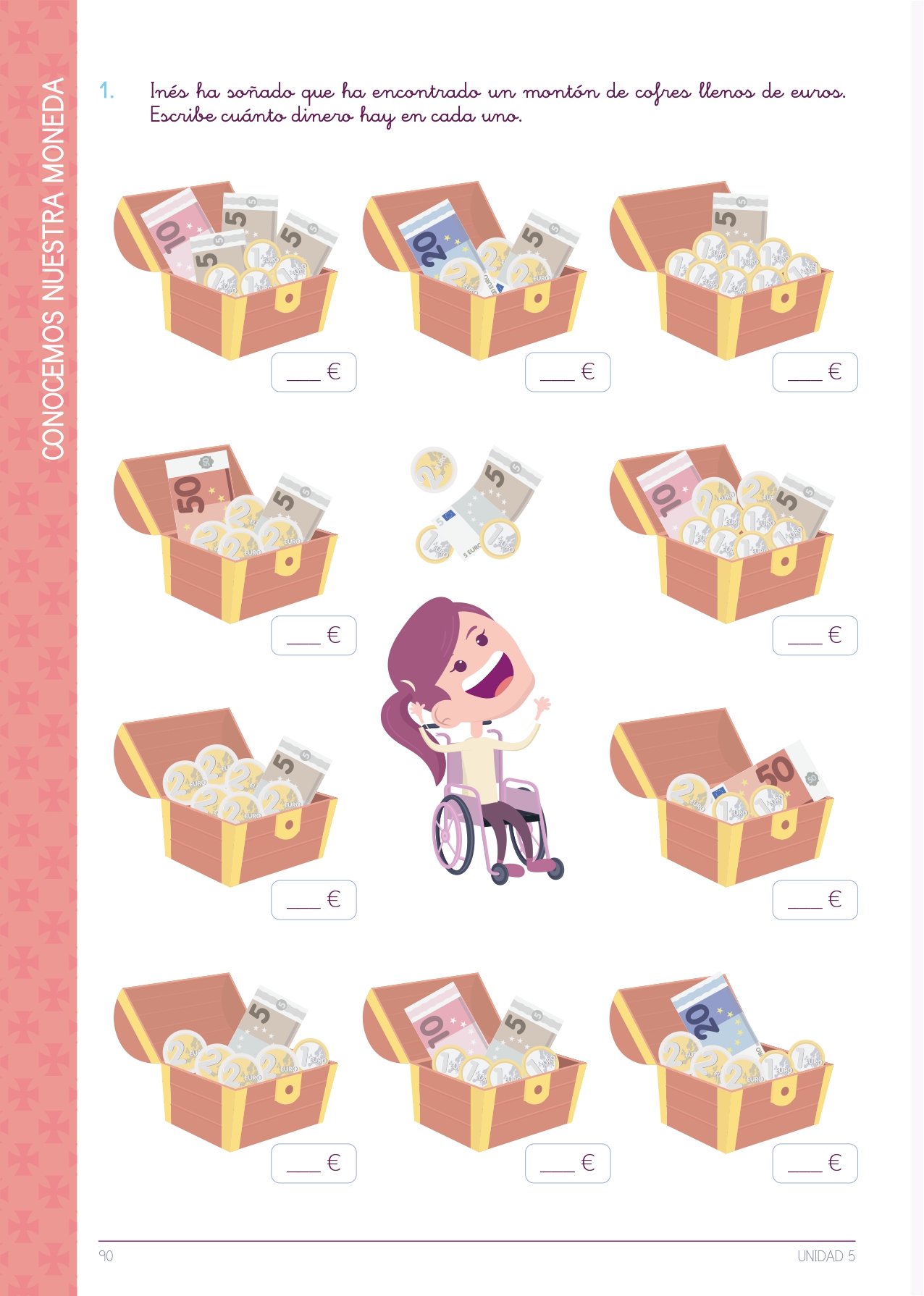 La actividad previa para esta página puede ser el juego que hemos elaborado para ella en el que aparecerán varias cantidades de dinero y tendrán que averiguar cuánto hay en cada caso.